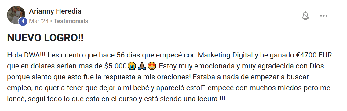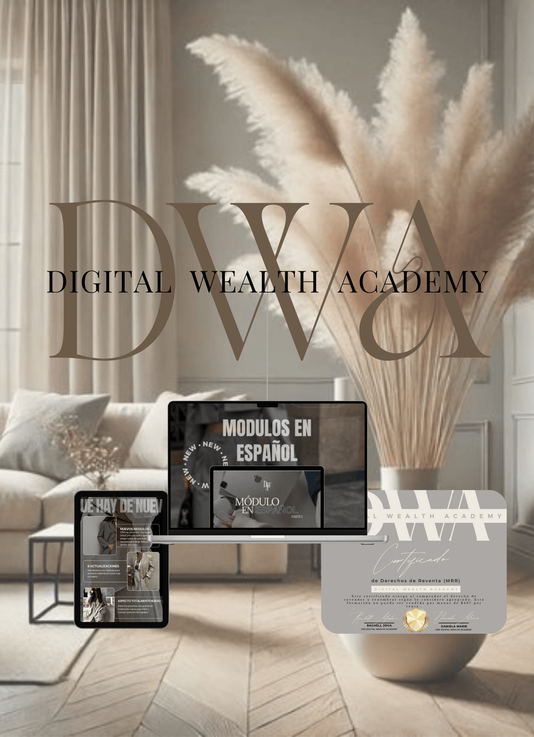 En mi programa tendrás acceso a toda la información de DWA con más de 220 videos que te explican paso a paso como lograrlo, un producto digital listo para vender, con derechos de reventa y con acceso a todas las actualizaciones de por vida, clases en vivo, sesiones 1 a 1 conmigo, te enseñaré mi propia estrategia que me llevo a vivir de esto, formarás parte de una comunidad de emprendedores con poder, tendrás acceso al curso hecho en 6 idiomas. ¡Si! Leíste bien, es el curso con mayor demanda a nivel mundial.