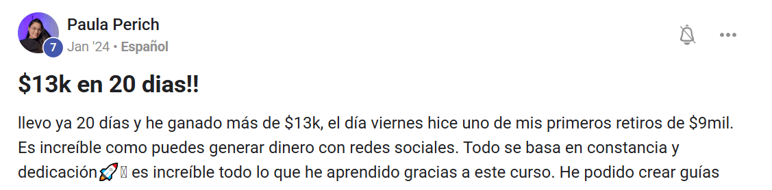 El curso se enfoca en la calidad y no tanto en la cantidad de seguidores. De hecho, en 2 semanas, creando una cuenta de Instagram desde 0, pude ganar 1.000€. (Mis primeras ventan llegaron cuando apensas tenía 100 seguidores.